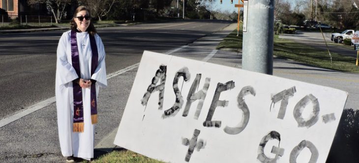 I confess I start a bit late and miss a few of the early morning faithful on their way to school and work, but the long, unwieldy piece of donated plywood needs a coat of white paint before the sponge dipped in black might march across its rugged surface proclaiming: Ashes To Go; and without any skills in the art department, I flounder even with three little words. The black paint drips at the edges, imitating the grainy black ash it advertises, but it will have to do. Then after painting the sign at the back of the church, I chide myself for the last minute plans that don’t include help carrying the sign to the front of the church. Fortunately, Dave Christopher, our local-pastor-in-training, stops by and grabs one end of the sticky plywood while I navigate the other. Soon we have the sign propped against a utility pole on the side of the rural highway our church calls home, and we are wiping our hands and open for business.